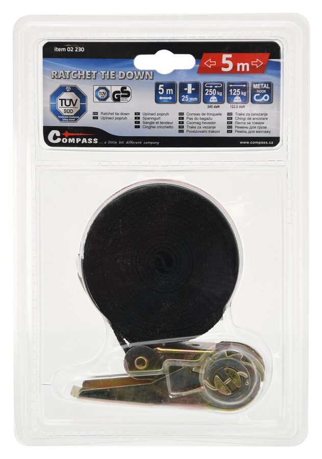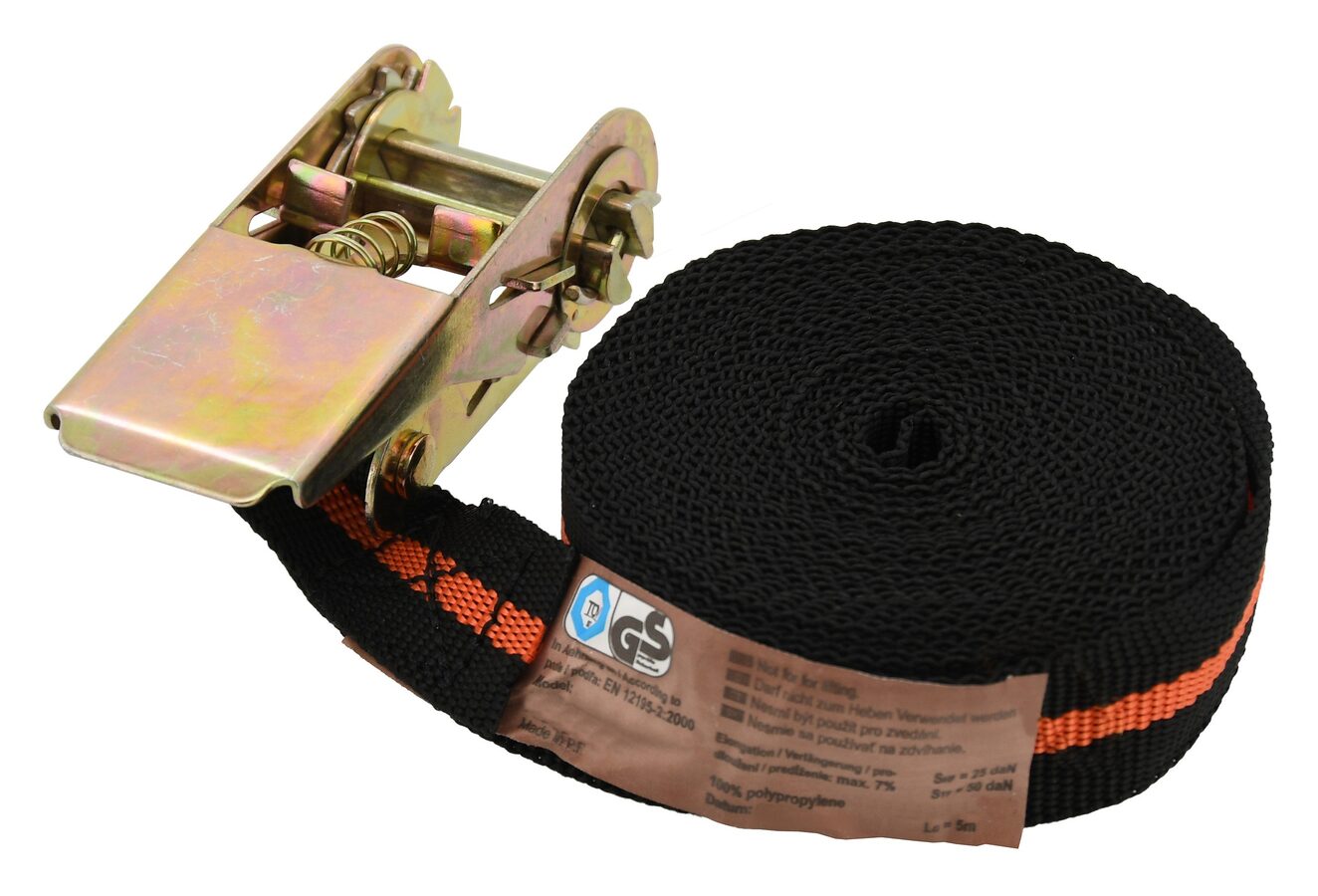 Jednodílný upínací popruh, s homologací TÜV/GS, pro zajištění středně těžkého nákladu. Ráčna je celokovového provedení s jistícím mechanismem a popruhem šíře 25 mm s délkou 5 m, připevněným přímo na upínací ráčně.
