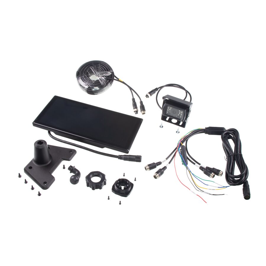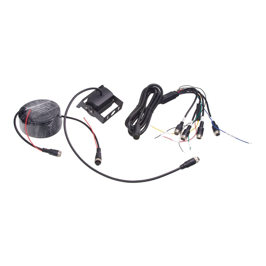 Obsah balení: Monitor, držák pro pevnou montáž + oboustranná páska, napájecí kabel pro připojení kamery na palubní napětí (ACC+BAT), zadní 4PIN kamera+ 4PIN 15m propojovací kabel.