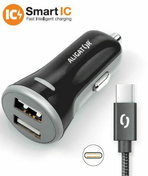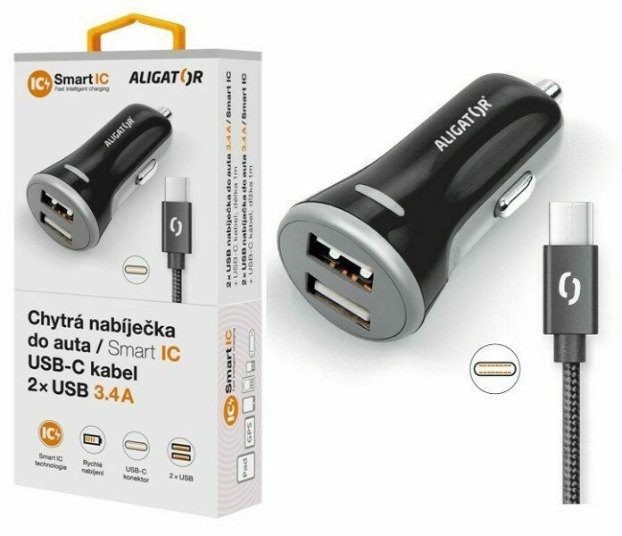 - Chytrá nabíječka do auta ALIGATOR 3.4A, 2x USB, smart IC, černá, včetně USB-C kabelu 2A