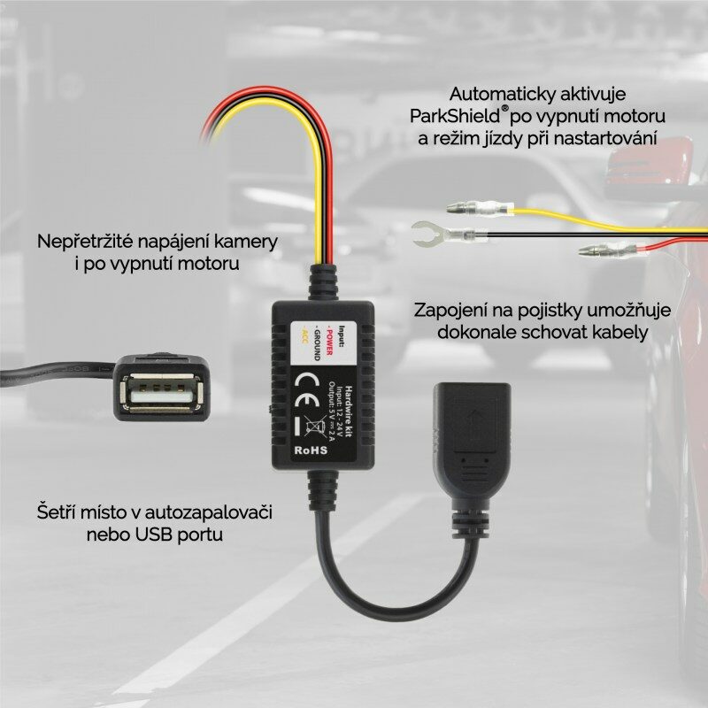 Příslušenství umožňující nepřetržité napájení autokamery z baterie vozidla i po vypnutí motoru, podpora funkce ParkShield®, univerzální USB–A výstup, Micro USB a Mini USB kabely v balení, zapojení bez viditelných…