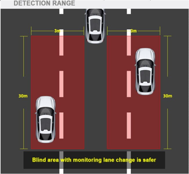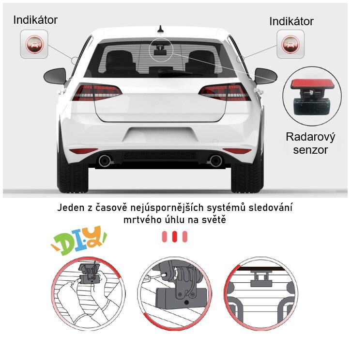 a detekuje zda-li se jakýkoliv pohyblivý objekt dostane do oblasti mrtvých úhlů a upozorní řidiče pomocí 2 LED indikátorů a 1 bzučáku pro zabránění případné kolize.