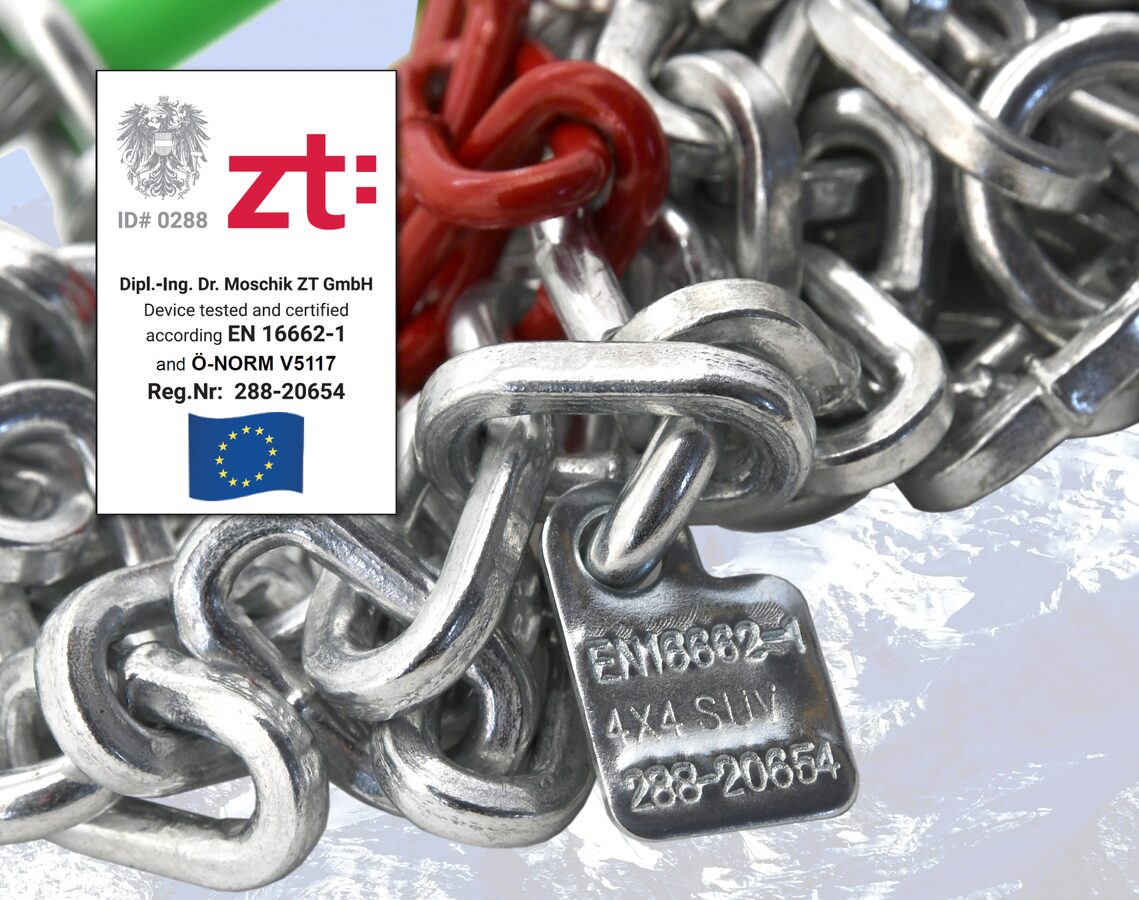 Sněhové řetězy, pro SUV/VAN do hmotnosti 7500 kg, splňující veškeré vyžadované evropské normy. Lze použít i pro dodávky a obytná vozidla.