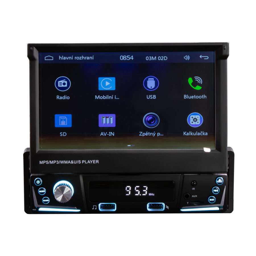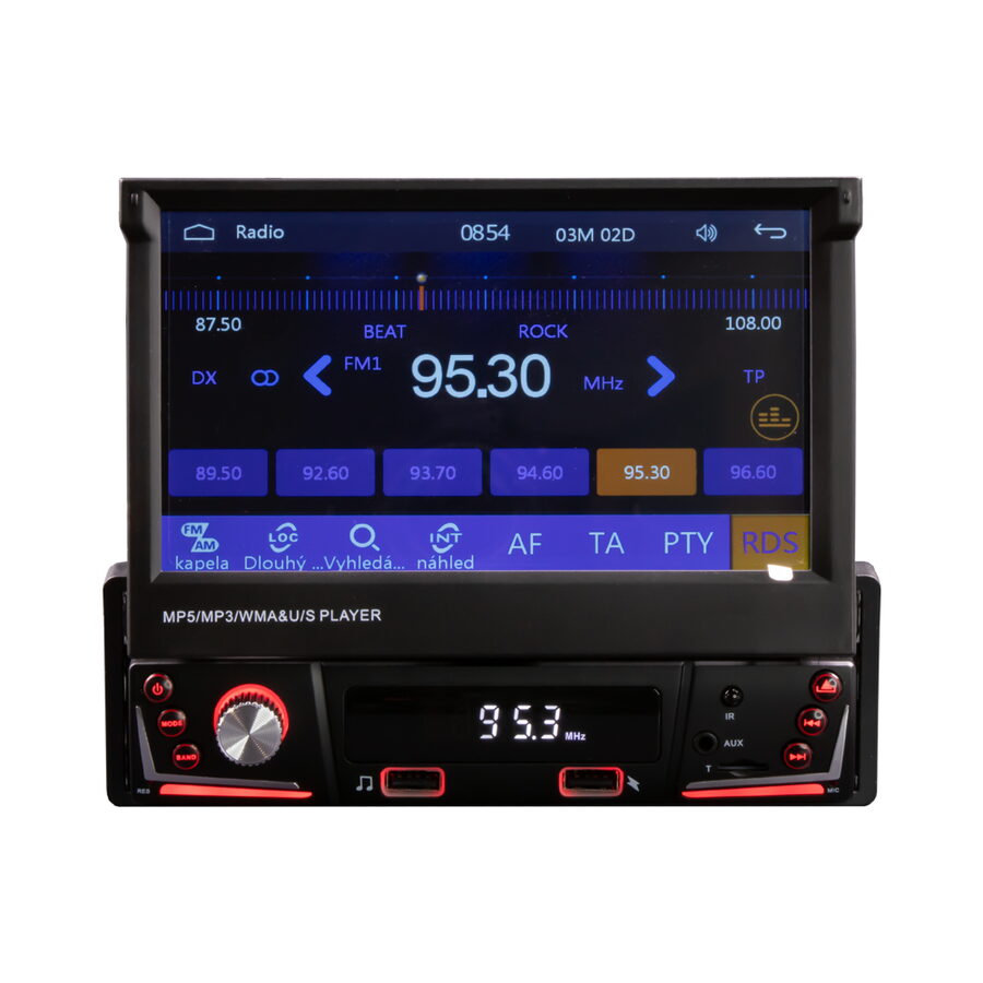 Autorádio s FM / MW, 7" TFT - LCD motoricky vyjíždějícím monitorem a čelním 2x USB.