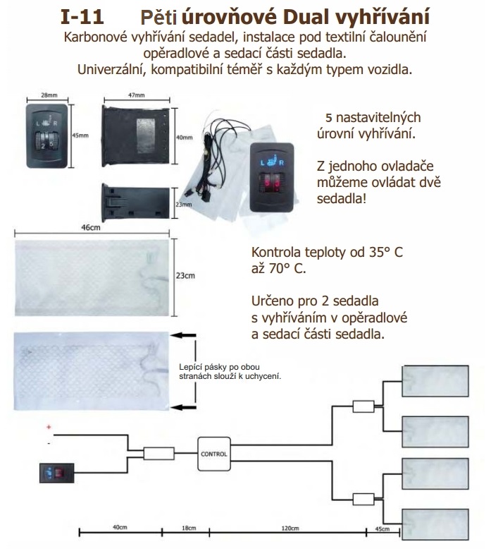 Pro 2 kusy sedadel. Univerzální 10 ti stupňové Toray karbonové vyhřívání seadel.