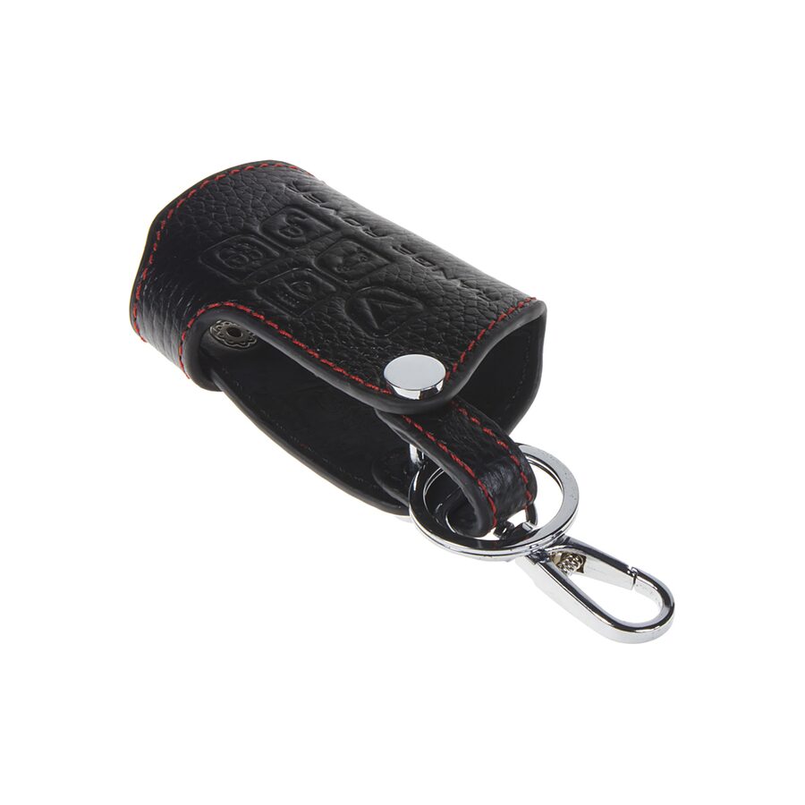 Černé kožené pouzdro pro autoklíč Land Rover. Chrání klíč před pádem, znečištěním a opotřebením (vhodné pro služební vozidla) a navíc vypadá velmi elegantně. Ovladač lze ovládat přímo v pouzdru, při použití klíče stačí pouze vyklopit. Vyrobeno z velmi kvalitní kůže s prošitím červenou nití.