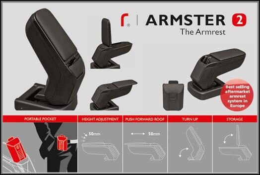Loketní opěrka je v dnešní době automobilový doplněk, který se začíná stávat nepostradatelnou součástí auta. Zaručuje velmi pohodlnou jízdu. Loketní opěrky Armster se vyznačují špičkovou kvalitou zpracování a širokou nabídkou funkcí. Horní část loketní opěrky je posuvná dopředu, tím získáme velké pohodlí na dlouhých cestách. Loketní opěrka je sklopná i výškově nastavitelná a součástí je pouzdro na mobilní telefon s uchycením za opasek. Základ je z pevného plastu a vrchní posuvná část z kůže.