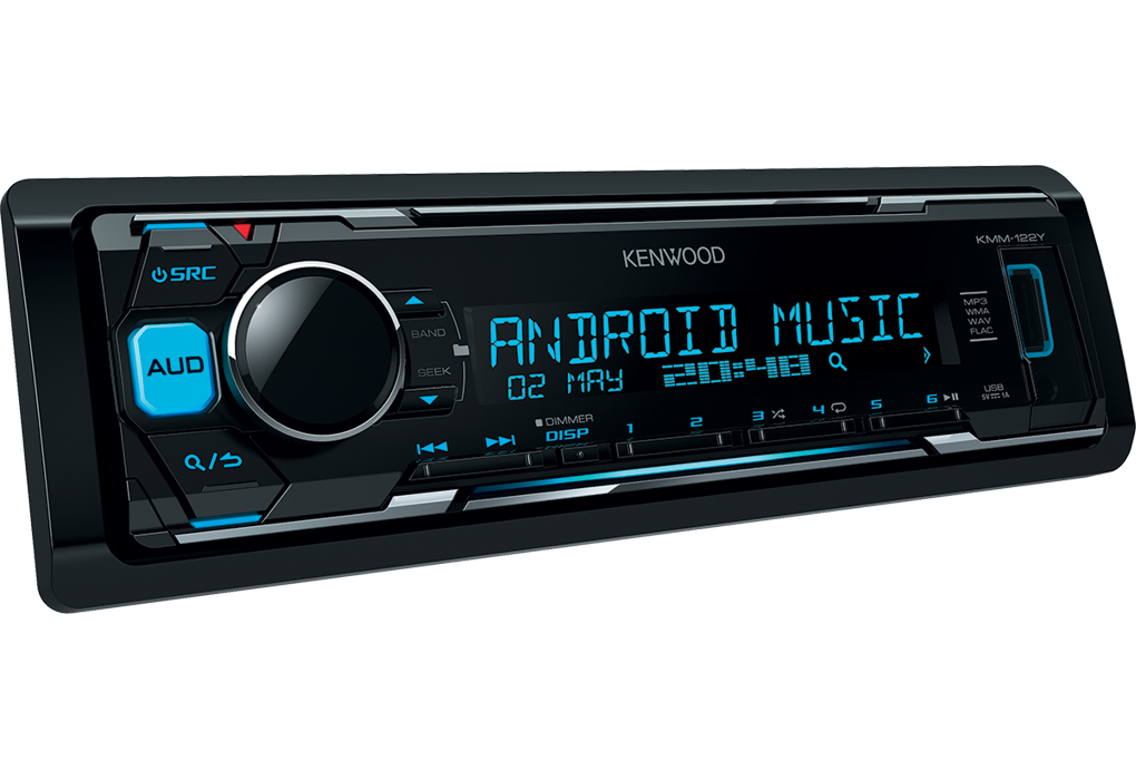 Kenwood KMM-123Y: 1-DIN bezmechanikové autorádio s USB, AUX in vstupem a variabilním podsvícením displeje a tlačítek.