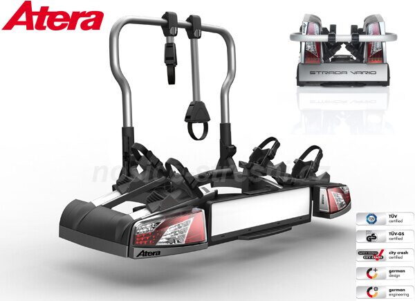 Systém Atera STRADA Vario 2 prvotřídního německého výrobce Atera, v prodejích v Německu překonává nosiče Thule. Tím se řadí do nejvyšší třídy nosičů kol na tažné zařízení. Dle dlouhodobých testů ADAC je tento nosič na úrovni THULE! Bezkonkurenčně nejlépe vybavený, bezpečný nosič kol s nejjednodušší obsluhou na trhu. Pro uchycení nosiče je nutno mít vůz vybaven tažným zařízením.
