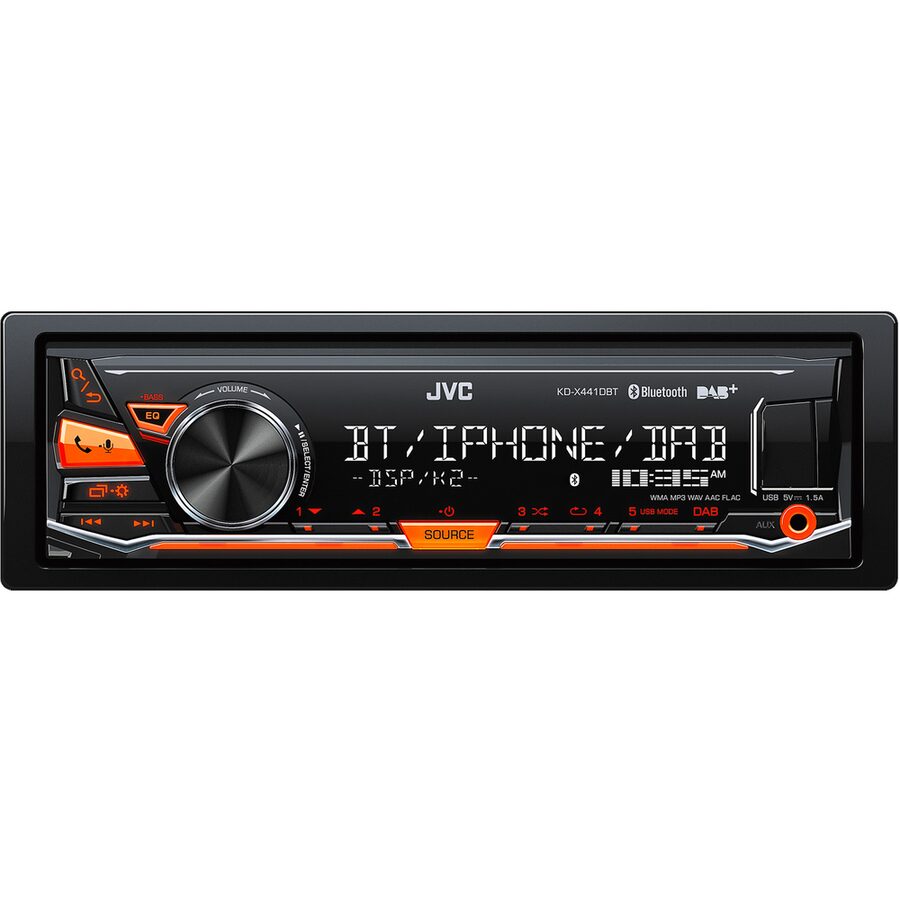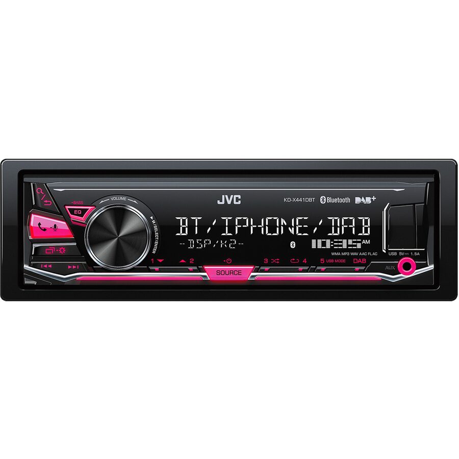 - x JVC DAB / FM autorádio bez mechaniky/Bluetooth/USB/AUX/červené pods./odním.panel