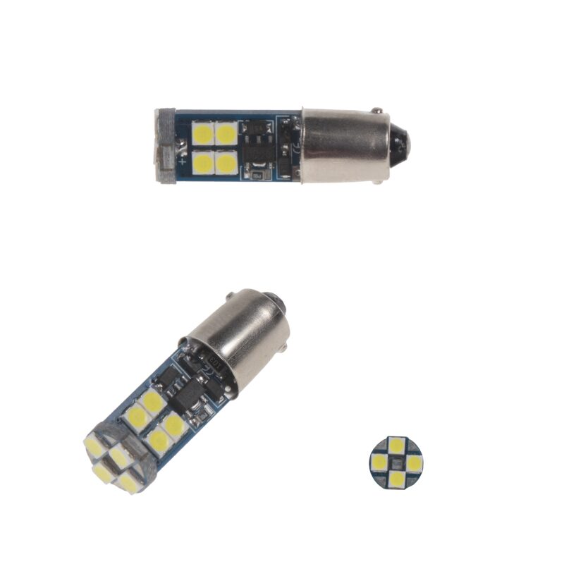 Náhradní LED žárovka s paticí BA9s, bílá, 12x vysocesvítivé LED diody 3030SMD, vhodná do parkovacích světel u novějších vozidel, odpovídá žárovce "celosklo" W5W. Díky teplotě světla 6000 K jsou LED žárovky ideálním doplňkem do reflektorů s xenonovými výbojkami, kde žluté světlo obyčejné žárovky působí rušivě.