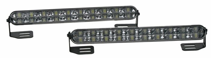 Kosoúhlá LED homologovaná světla pro denní svícení. Světla se vyznačují především svojí mírně kosoúhlou (zaoblenou) konstrukcí, která geometricky ladí s půdorysnou konturou většiny moderních automobilů se zaoblenou přídí.#n#Rozměry š 220 x v 24 x h 35 mm. Světla je vybavena elektronikou, která zajistí automatické rozsvícení po zapnutí zapalování a zhasnutí při zapnutí potkávacích světel vozidla. Homologace dle EHK/OSN č. 48 pod číslem E4 - 000007#n#- spotřeba 2 x 5 W#n#- napájecí napětí 12 V i 24 V#n#- v každém světle 20 vysocesvítivých LED diod typu superflux#n#- životnost po celou dobu provozu vozidla#n#- robustní vodotěsné provedení#n#- velice efektní bílé světlo s teplotou 6000K (jako xenony)#n##n#- světla mají vestavěný modul automatického svícení#n##n#Použití světel pro denní svícení#n#V souvislosti s novými legislativními podmínkami upravujícími provoz motorových vozidel a nařizujícími celodenní svícení je velice aktuální náhradní osvětlení vozidel určené výhradně pro osvětlení ve dne za nesnížené viditelnosti.#n#Provedení a umístění světel pro denní svícení je dáno homologačním předpisem EHK/OSN č. 48, který předepisuje vyhláška č. 341/2002 Sb. a jejich používání se řídí zákonem č. 361/2000 Sb. o provozu na pozemních komunikacích pozměněným zákonem č. 411/2005 Sb.#n#Světla pro denní svícení se vyznačují silně rozptýleným tokem světla, který netvoří kužel jako u běžných reflektorů. Rozptýlené světlo svým charakterem neoslňuje protijedoucí řidiče ani neosvětluje vozovku, ale v dostatečné míře zajišťuje zásadní podmínku bezpečného provozu "být viděn".#n#Hlavním přínosem těchto přídavných světel je úspora energie, neboť při jejich používání nesvítí obrysová, potkávací ani koncová světla vozidla. Úsporu přinese také prodloužení životnosti žárovek či výbojek, kterou pocítí především řidiči vozidel s xenonovými světlomety, jejichž výbojky mají sice delší životnost než běžné žárovky, ale jejich výměna je výrazně nákladnější.#n#Montáž světel pro denní svícení není přestavbou vozidla ani změnou technických údajů, a proto jejich umístění na vozidlo nepodléhá žádnému dodatečnému schvalování ani zápisu.#n##n#Základní pravidla pro dodatečnou montáž světel pro denní svícení:#n#- na jedno vozidlo se montují dva kusy (jeden pár) světel#n#- umísťují se ve vodorovné rovině ve výšce od 250 mm do 1500 mm na přední část vozidla#n#- vzdálenost světel od bočního obrysu je max. 400 mm a vzájemně mezi světly min. 600 mm (u vozidel s šířkou menší než 1300 mm je povolena vzájemná vzdálenost 400 mm)#n#- světla se musí rozsvítit automaticky po zapnutí zapalování (nastartování motoru) a zhasnou po jeho vypnutí#n#- při rozsvícení obrysových světel musí světla pro denní svícení automaticky zhasnout