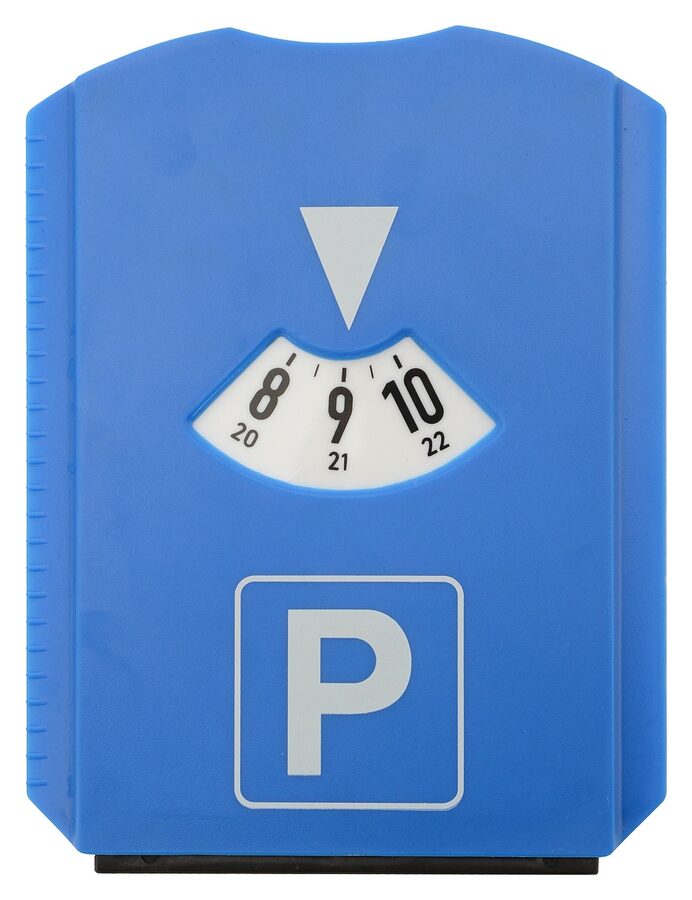 Parkovací hodiny z odolného plastu s otočným diskem.