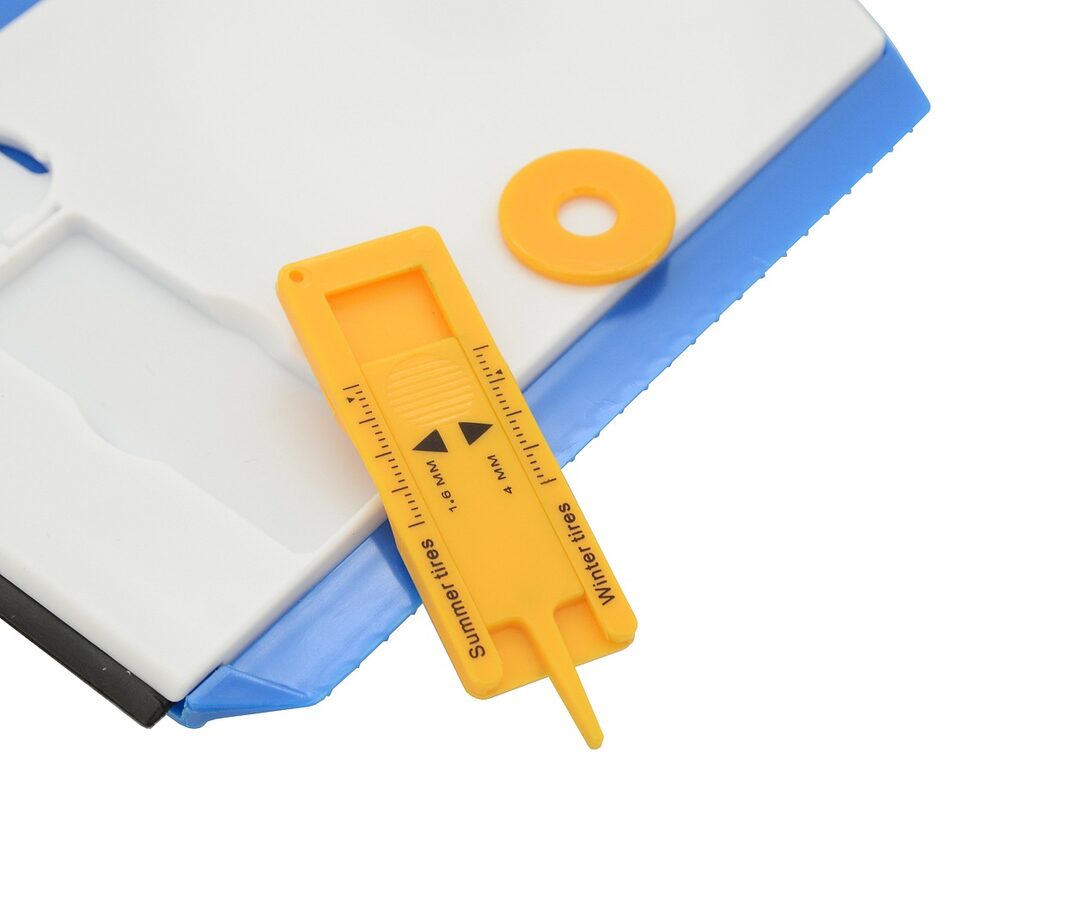 Navíc jsou na zadní straně připevněny další užitečné pomůcky. Žeton do nákupního vozíku a měrka pro orientační měření hloubky dezénu pneumatik.