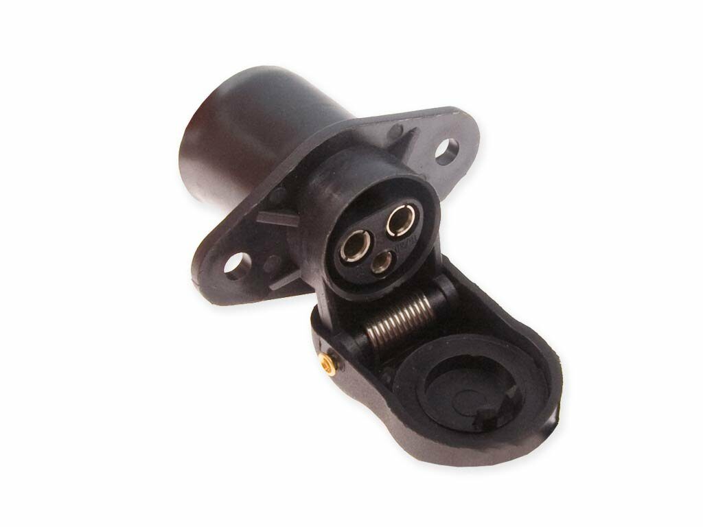 Zásuvka 3pin pro přívěsy a návěsyPřipojení vodičů pomocí 3PIN zásuvky.2x 6,3 mm, 1x 4,8 mm na kostru. Maximální proud 20A.