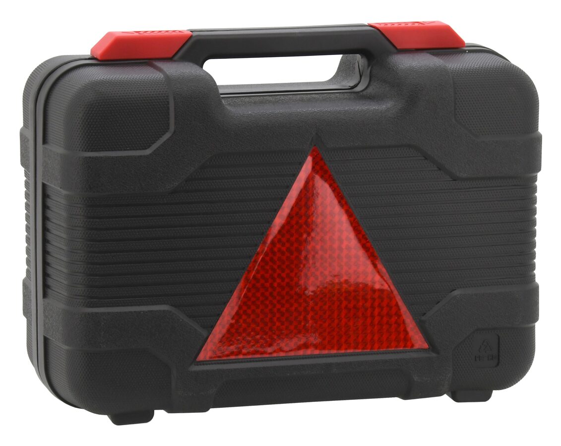 V praktickém kufříku spolu s adaptéry, s nářadím a se sadou na nouzovou opravu bezdušových pneumatik, bez nutnosti demontáže pláště z disku.