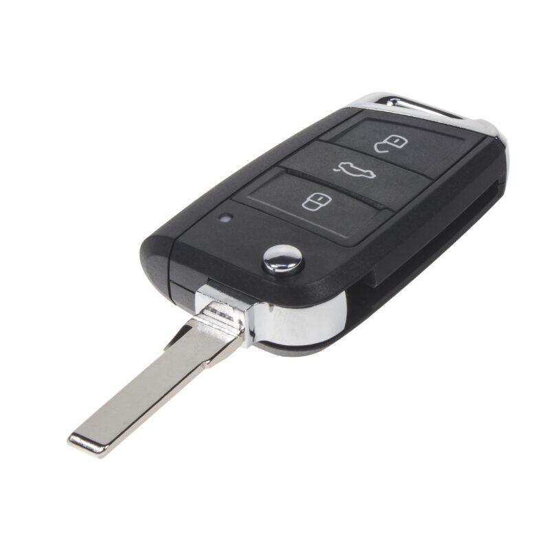 Náhradní vystřelovací autoklíč s dálkovým ovladačem pro vozy koncernu VW platformy MQB. Součástí klíče je dálkové ovládání centrálního zamykání se třemi tlačítky a čip pro imobilizér.