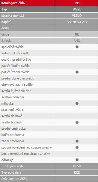 Sdružená svítilna W29L (185) Výrobce: WAS Strana montáže: levá Napětí: 12-24V Funkce: s mlhovkou, osvětlení SPZ zespodu Rozměry: 230 x 110 x 79 mm .