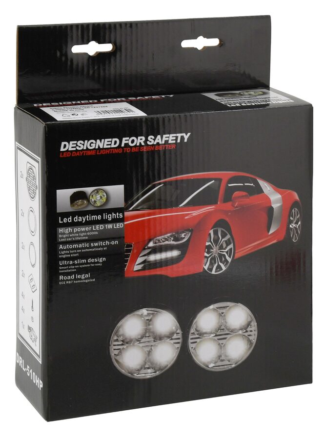 - LED světla pro denní svícení 4 HIGH POWER LED 12V/24V, kulatá 70mm, ECE