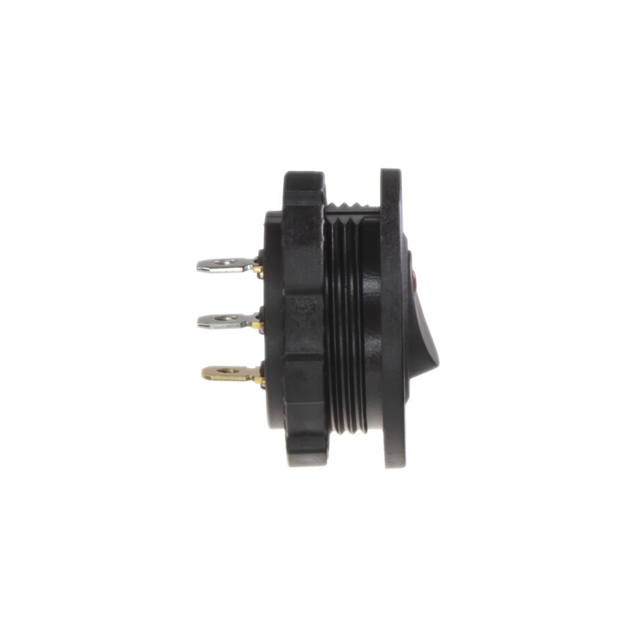 Spínač kolébkový kulatý 20A červená LED. Spíná kladné napětí mezi kontakty 1 a 2, na kontaktu 3 je kostra pro podsvícení.