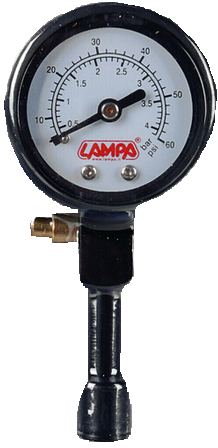 Pneuměřič od italské firmy Lampa. Maximální možné měřené hodnoty 4,2 barů / 60 psi.