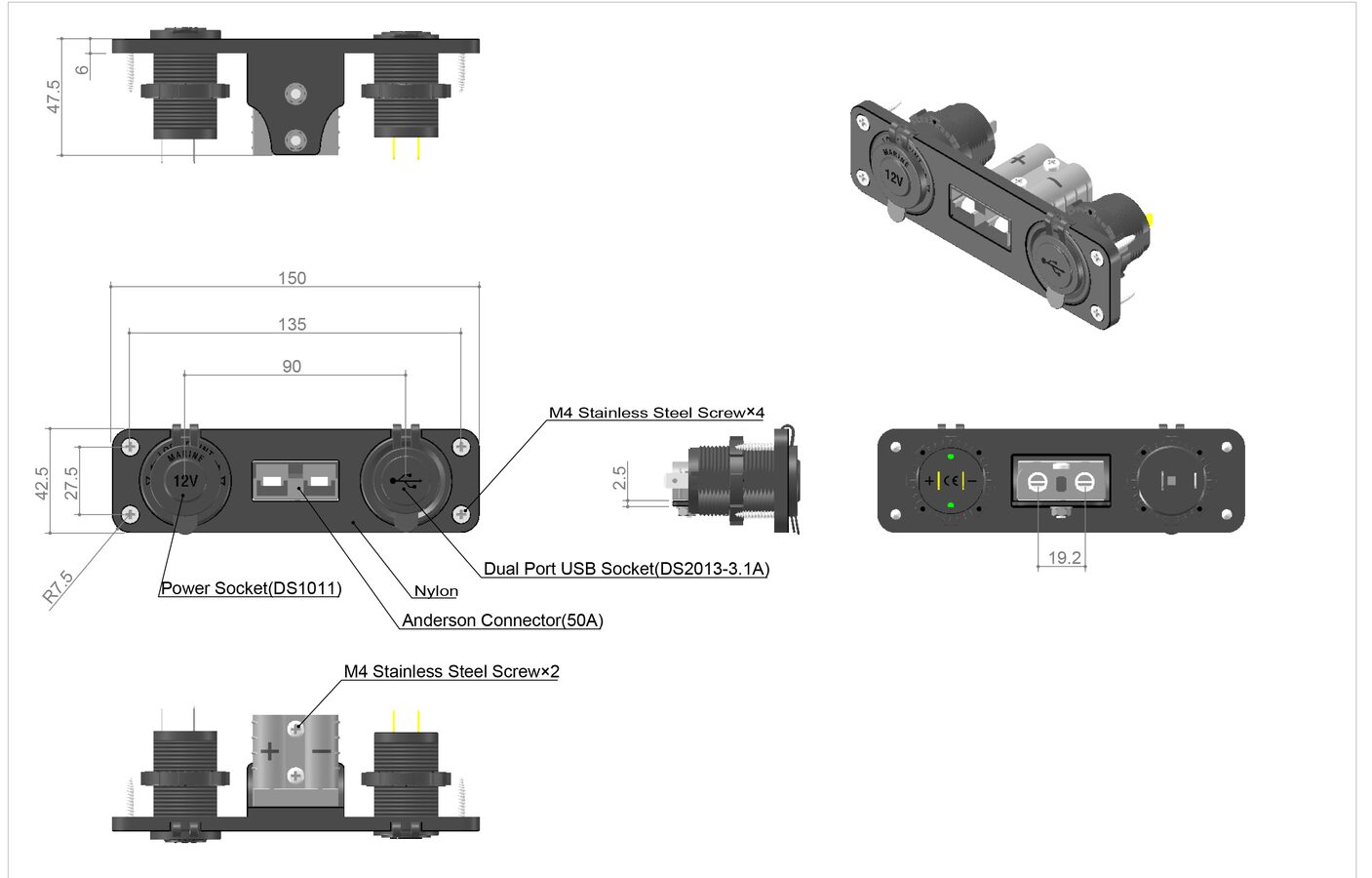 - Dvojitá CL,2x USB + Anderson zásuvka 50A do panelu