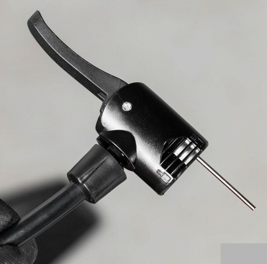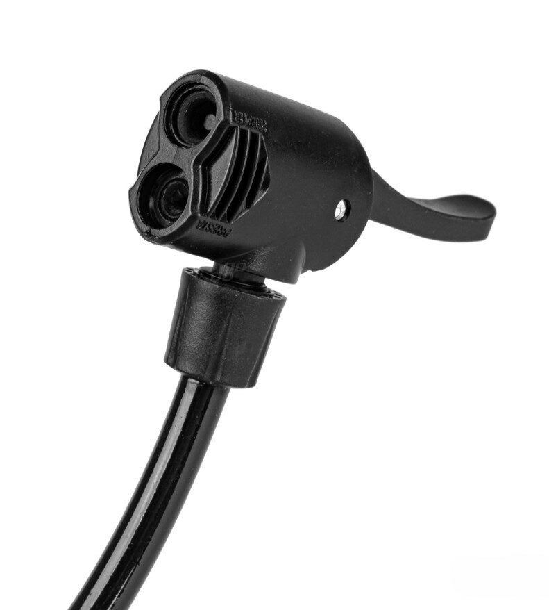 Díky dvojitému adaptéru na konci hadice lze hustilku použít jak na klasický automobilový ventilek, tak na cyklistický (galuskový ventilek).