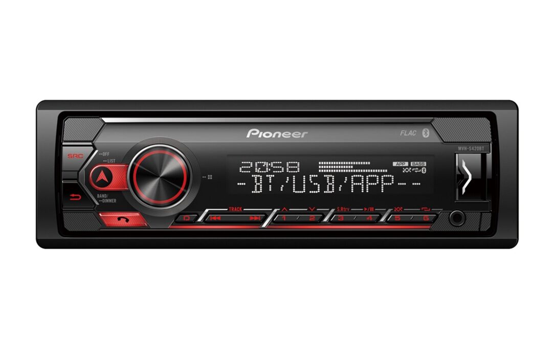 1-DIN autorádio bez CD mechaniky s čelním USB vstupem, AUX in vstupem, vestavěným Bluetooth modulem, Spotify a podporou bezztrátového kompresního poměru FLAC.