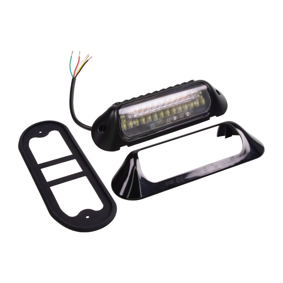Vysoce výkonné bílé nástěnné světlo s oranžovým výstražným světlem, určené pro povrchovou montáž na stranu vozidla, především na různé pracovní stroje, sanitky, hasiče, zásahová vozidla, obytné automobily a karavany.