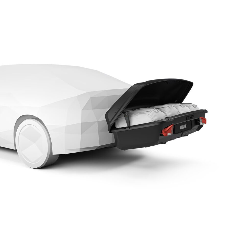 Thule Arcos je přepravní box na tažné zařízení s pevnou skořepinou, navržený tak, aby poskytoval extra úložný prostor a snadný přístup do kufru.