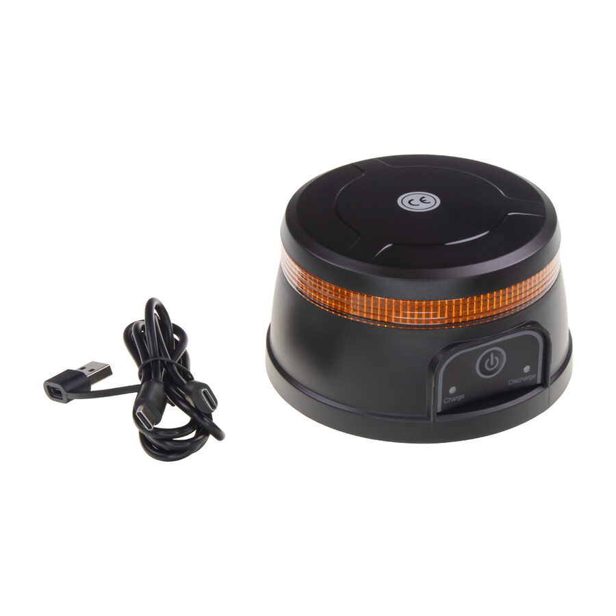Akumulátorový nabíjecí výstražný oranžový maják s LED technologií a zábleskovým / otočným režimem. Určen pro uchycení pomocí magnetu.