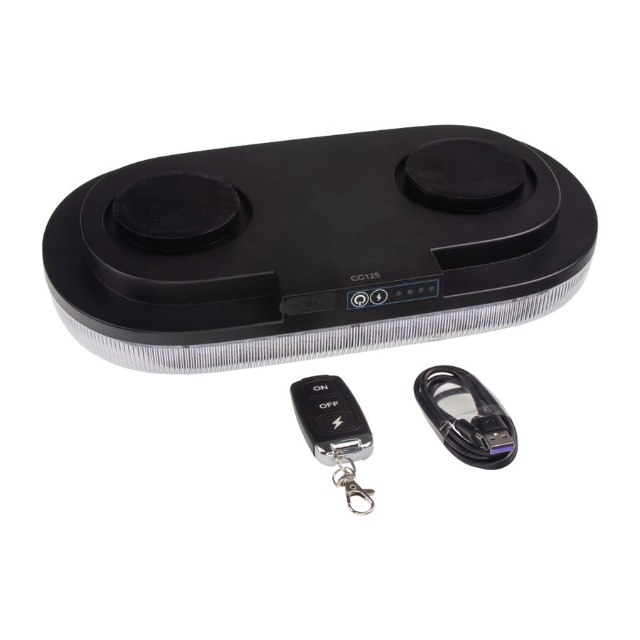 Akumulátorová nabíjecí miniaturní výstražná modrá LED světelná rampa s různými režimy blikání a dálkovým ovladačem. Určena pro uchycení pomocí magnetu.