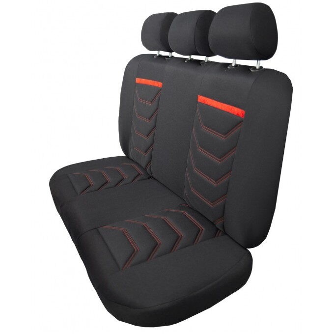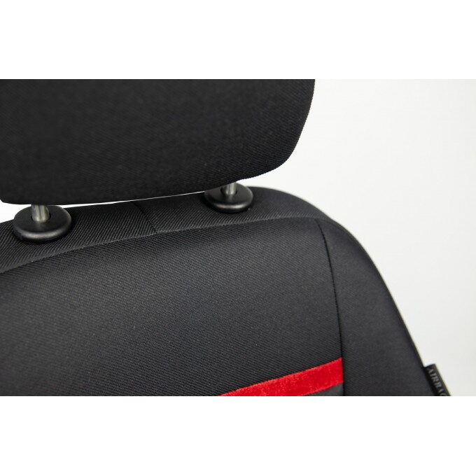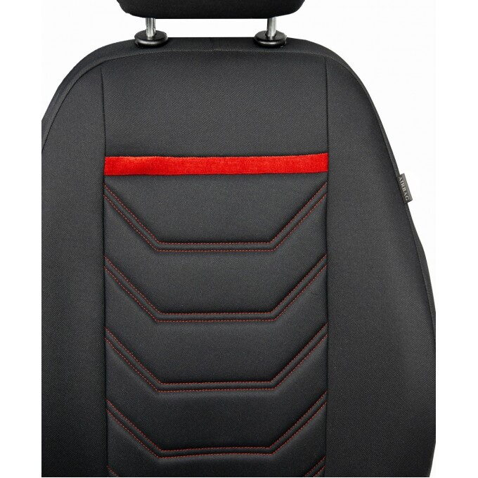 • Design a styl: autopotahy v elegantní černé barvě je doplněno výrazným červeným vodorovným pruhem a prošíváním ve tvaru "V", které imituje sportovní sedadla