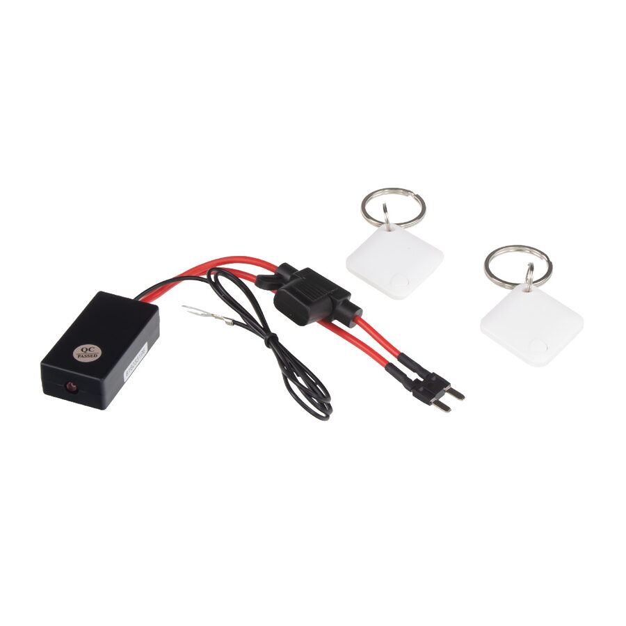 Bezdrátový imobilizér motoru - skrytý start blokátor 12 V. Zabezpečte své vozidlo před neoprávněným nastartováním díky tomuto nenápadnému bezdrátovému imobilizéru. Zařízení umožňuje zablokovat start motoru, dokud není v dosahu spárovaný bezdrátový přívěsek (RFID tag).