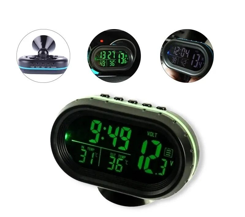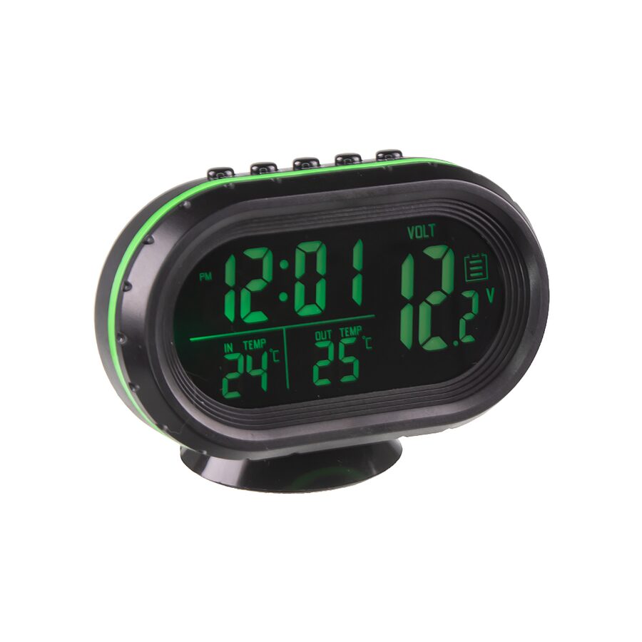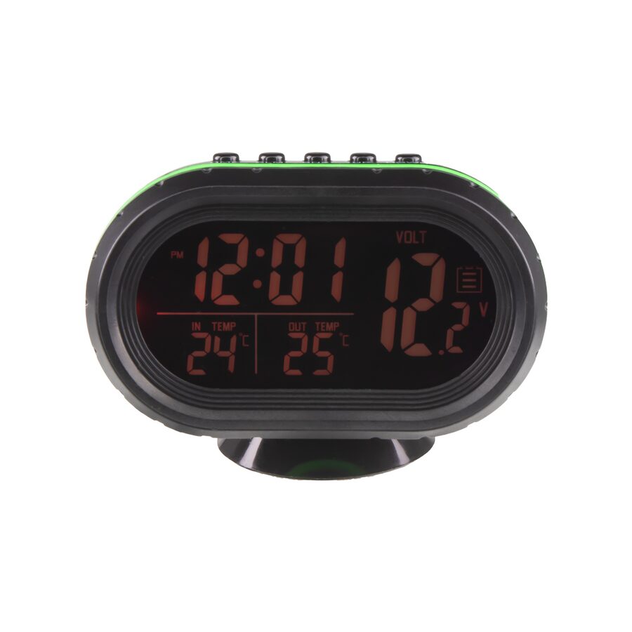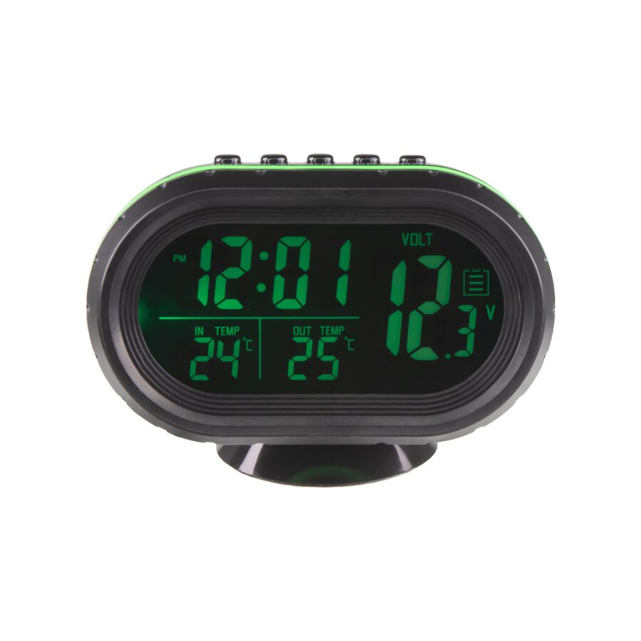Digitální teploměr pro zobrazování vnitřní a vnější teploty, hodiny a palubní napětí / voltmetr se zeleným/modrým podsvětlením.