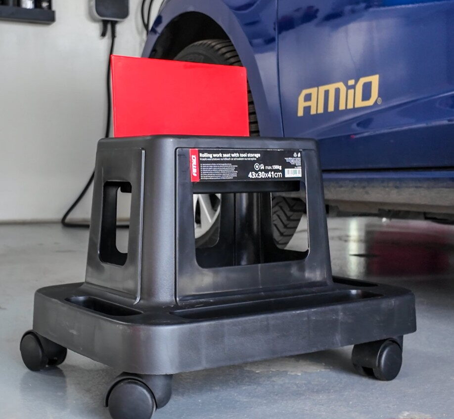 • V garáži: Usnadňuje práci na nízkých plochách a zároveň udržuje nástroje organizované.
