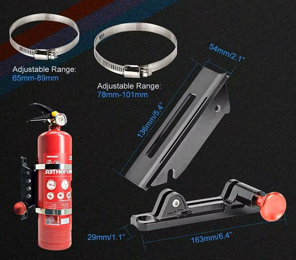 Tento robustní a snadno použitelný držák umožňuje bezpečnou montáž hasicího přístroje v automobilu, závodním voze nebo v dílně. Díky rychloupínacímu mechanismu lze přístroj velmi rychle a bez nástrojů uvolnit či upevnit — ideální pro použití v krizových situacích i běžném provozu.