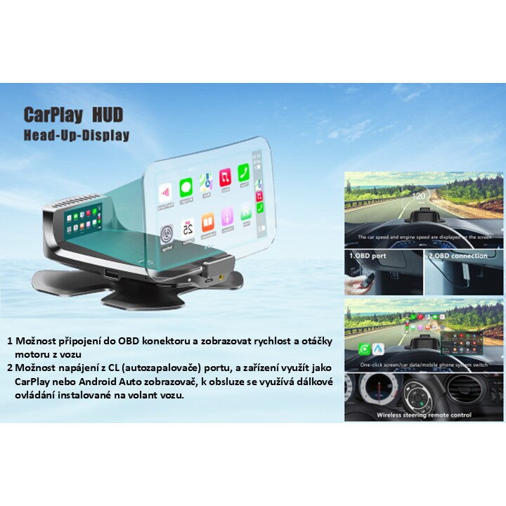 HEAD UP DISPLEJ se zobrazením CarPlay + Android Auto, reflexní deska