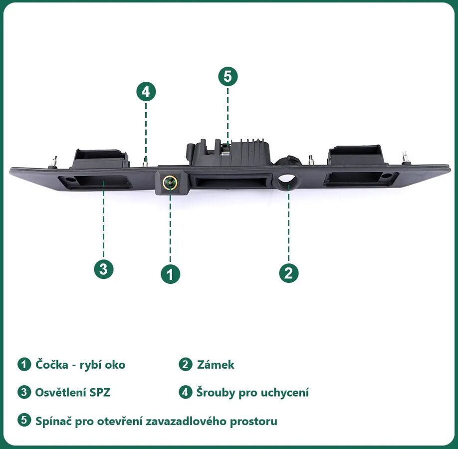 Barevná AHD/CVBS kamera integrovaná do ovladače kufru. Vhodné např. pro kombinaci s monitorem, nebo s adaptéry mi-xxx pro připojení k originální navigaci. Montáž: Vyjmete spínač kufru nad zadní SPZ a místo něj vložte do originálního otvoru tuto kameru, která zároveň nahradí původní spínač kufru.