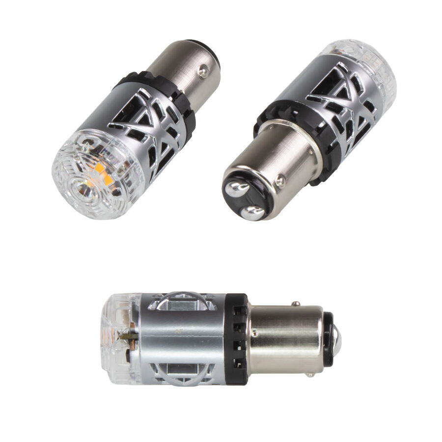 Nová generace LED autožárovek (high brightness) s aktivním chlazením a s paticí BAY15D (dvouvláknová), bílo / oranžová.