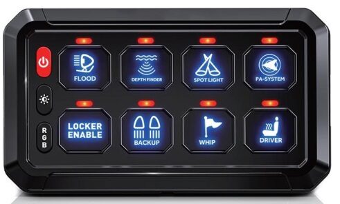 Multipřepínač s podsvícenými ovládacími tlačítky umožňuje spínat 8 různých světel a jiných zařízení s příkonem do celkových 60 A.