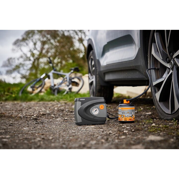 OSRAM TYREseal KIT ESSENTIAL obsahuje 450 ml lahvičku s těsnicím prostředkem na pneumatiky a prémiový analogový kompresor.