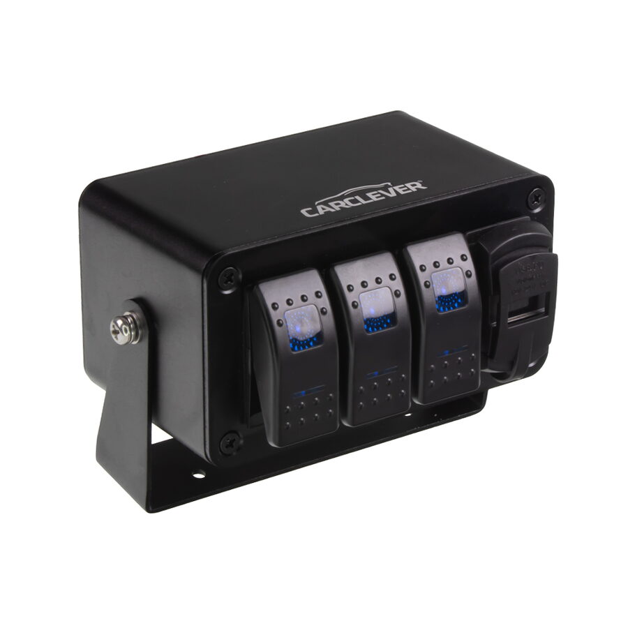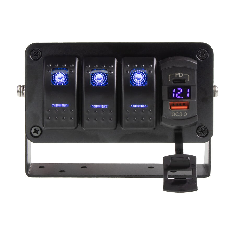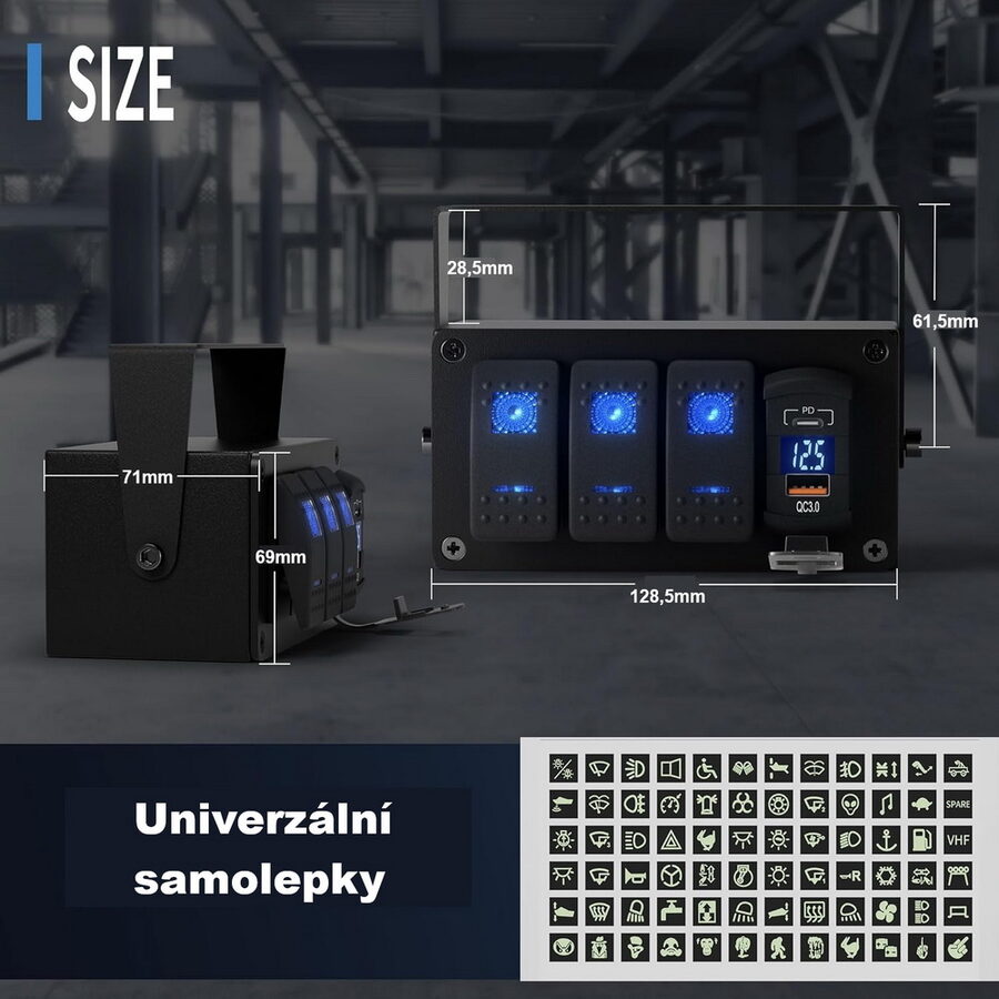 - Panel s 3x spínači Rocker, voltmetr + USB/USB-C zásuvka, 12/24V