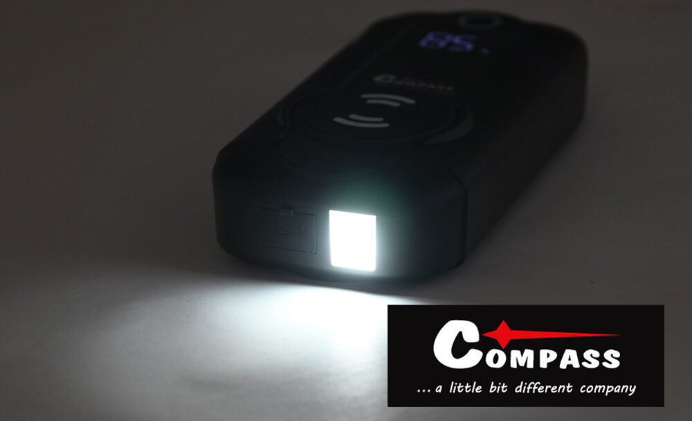 Powerbanka s kapacitou 8.000mAh s rychlým nabíjením USB, bezdrátovým Qi nabíjením a funkcí nouzového startování vozidla pomocí Smart klipsů.