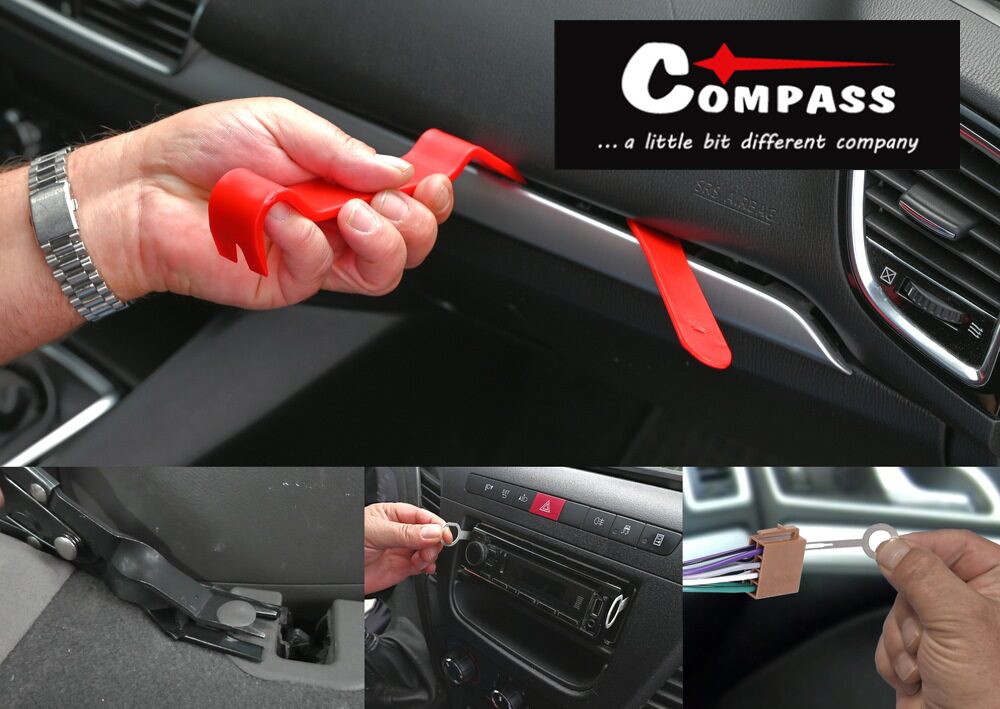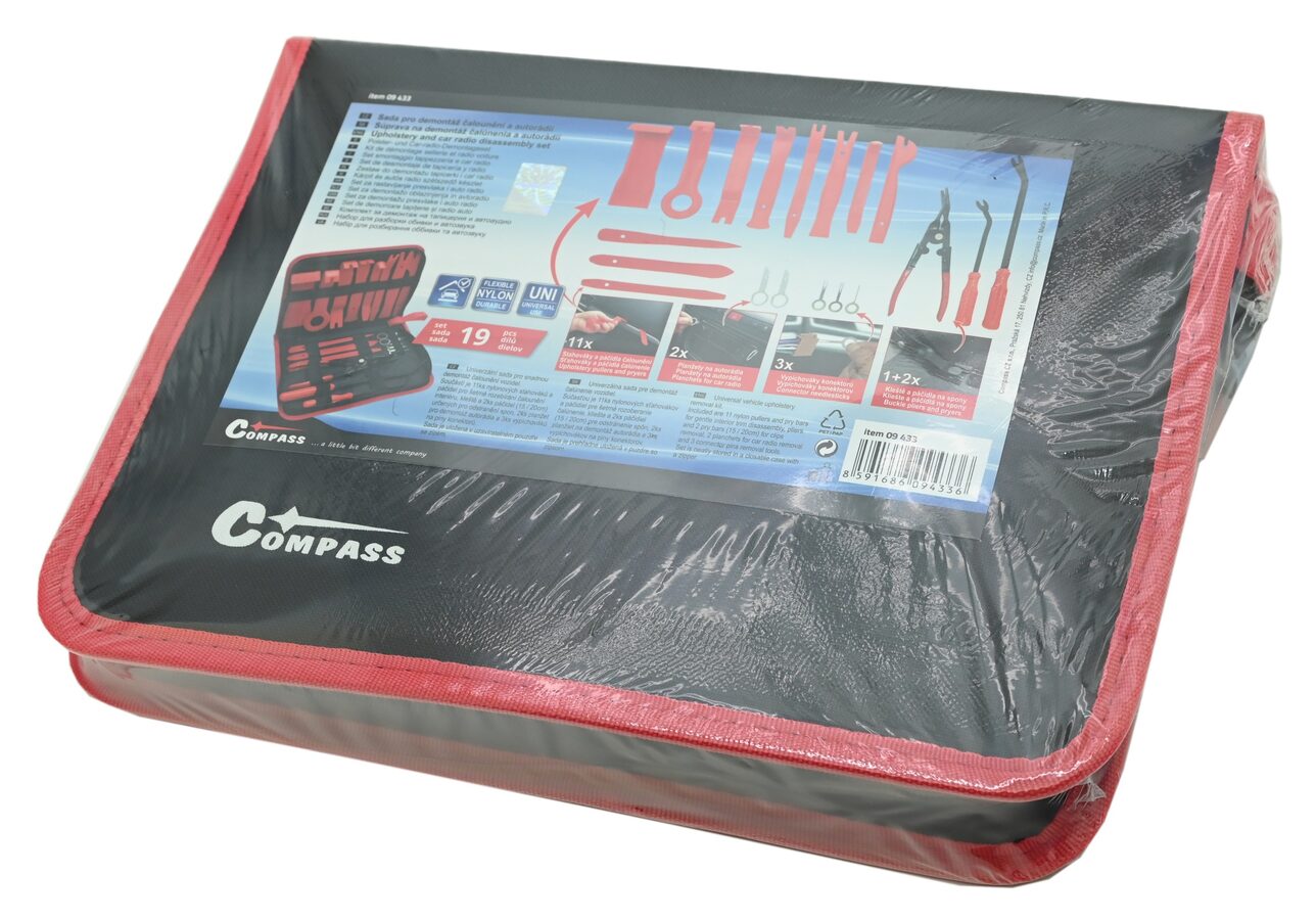 Obsahuje 11 kusů pružných nylonových stahováků a páčidel, navržených pro bezpečné rozebírání interiéru bez poškození povrchů. Součástí sady jsou také kleště a dvě páčidla (15 a 20 cm) pro odstranění spon, 2 planžety pro demontáž autorádia a 3 vypichováky na piny konektorů.