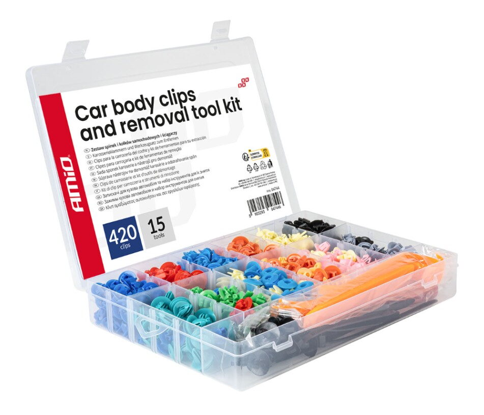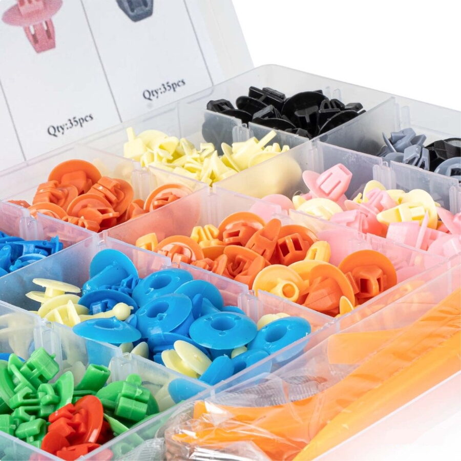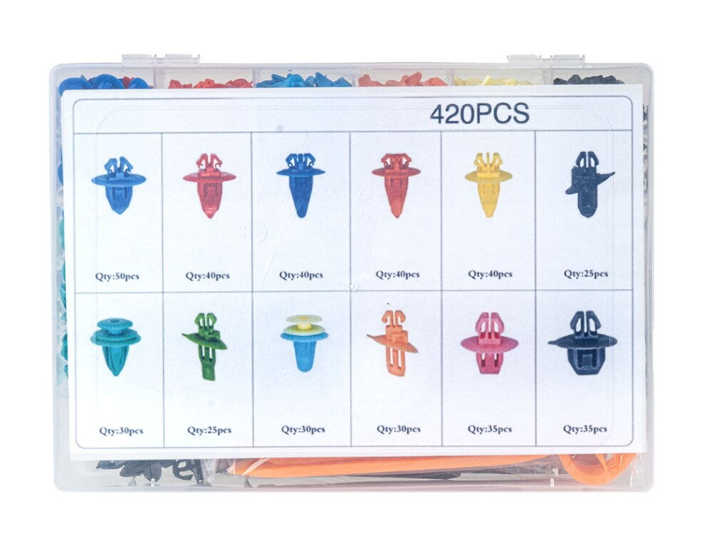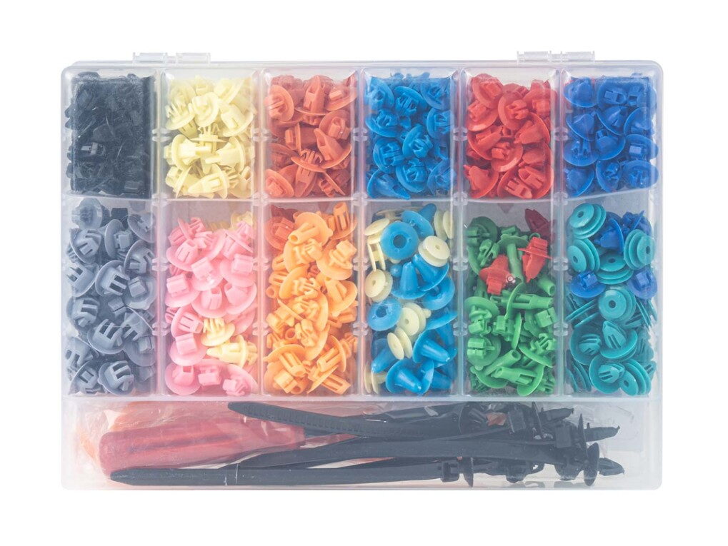 Profesionální sada 420 montážních spon a kolíků spolu s 15 nástroji pro demontáž a montáž prvků karoserie automobilu.