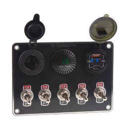 Panel s 5x spínači + 2x USB/Voltmetr a CL zásuvka, 12/24V