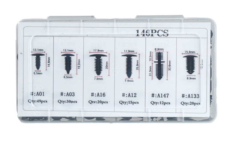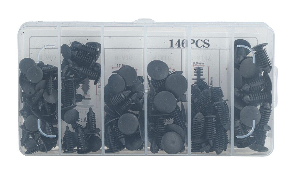 Profesionální sada 146 montážních spon, klipů a kolíků určená pro opravy a servis karoserií automobilů.