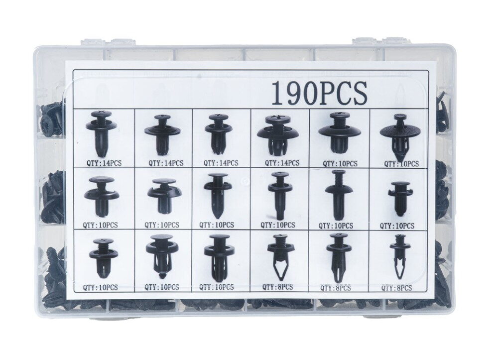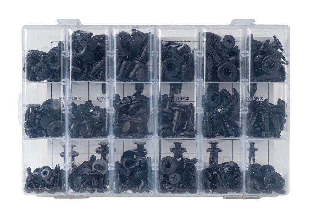 Profesionální sada 190 montážních spon, klipů a kolíků určená pro opravy a servis karoserií automobilů.