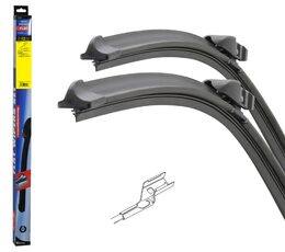 Sada dvou plochých stěračů FLAT (řidič + spolujezdec) se speciálním uchycením. Délky stěračů a systém uchycení na ramínko jsou přizpůsobeny vybraným vozům.