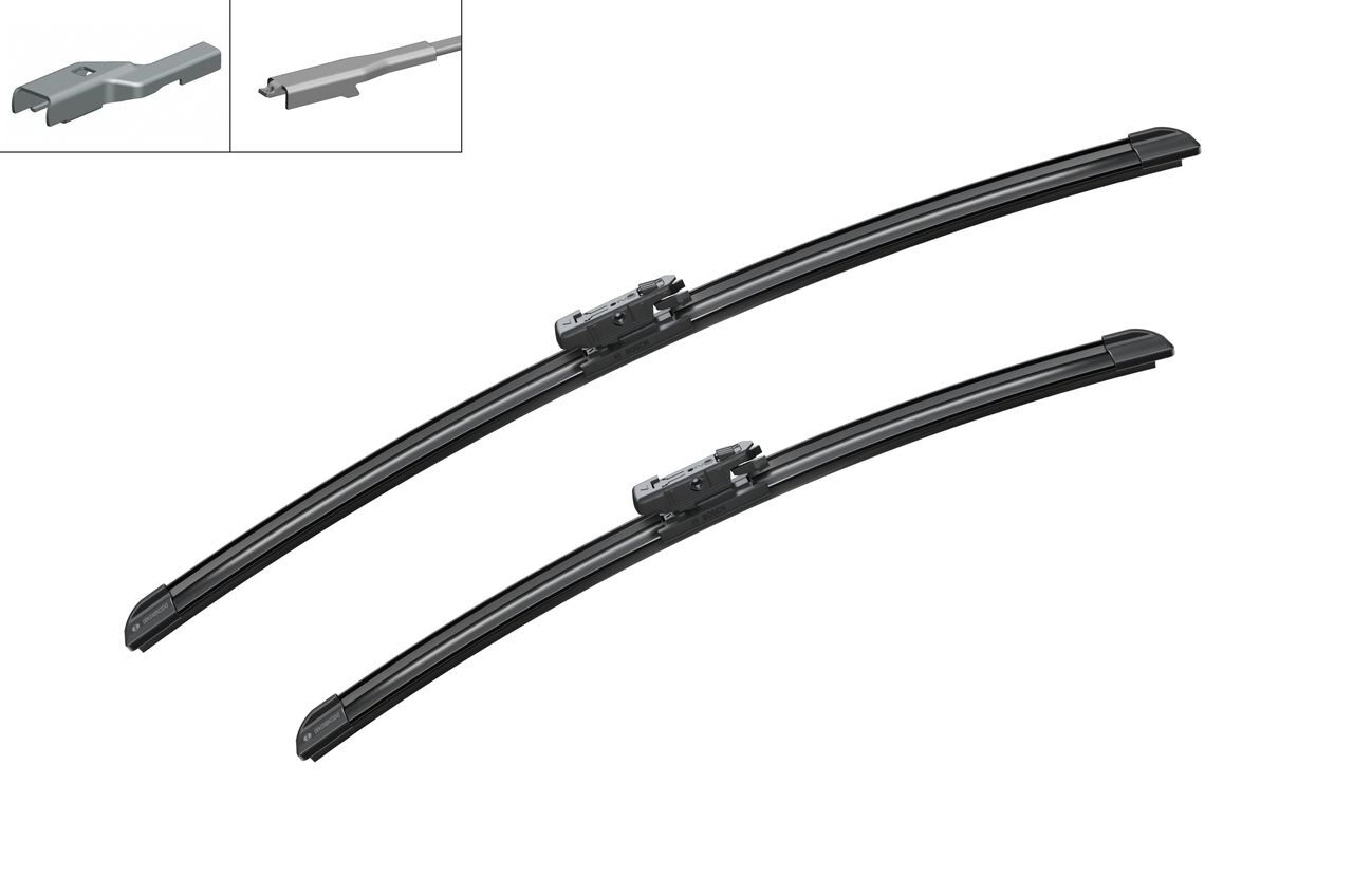 Sada dvou plochých stěračů BOSCH (řidič 725 + spolujezdec 625) se speciálním uchycením. Délky stěračů a systém uchycení na ramínko jsou přizpůsobeny vybraným vozům.